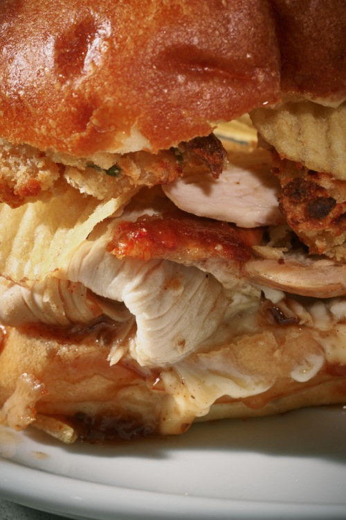 Turkey, ham, sausage sage stuffing, parmesan, carmelised onion mayo, hunky dory potato crisps.