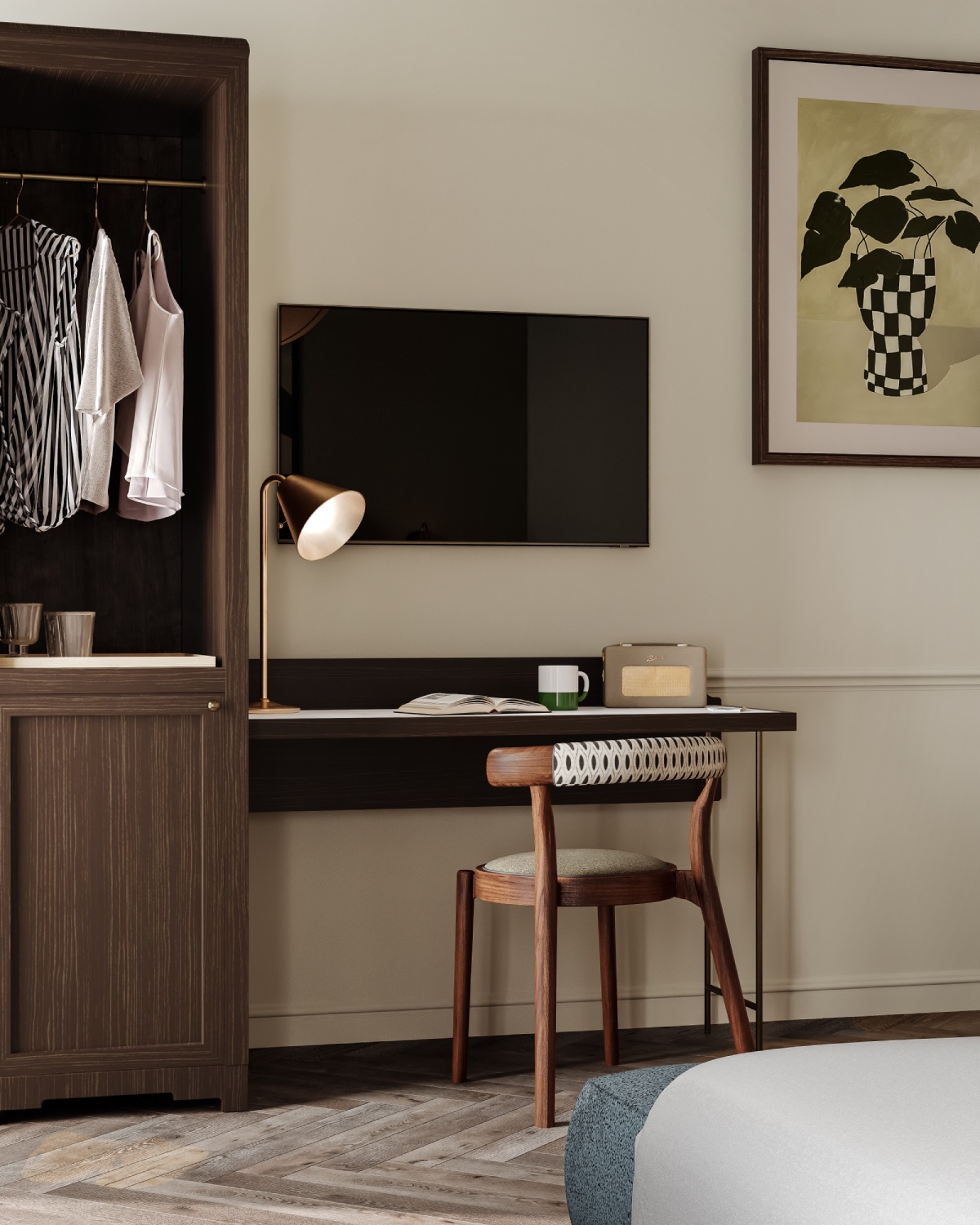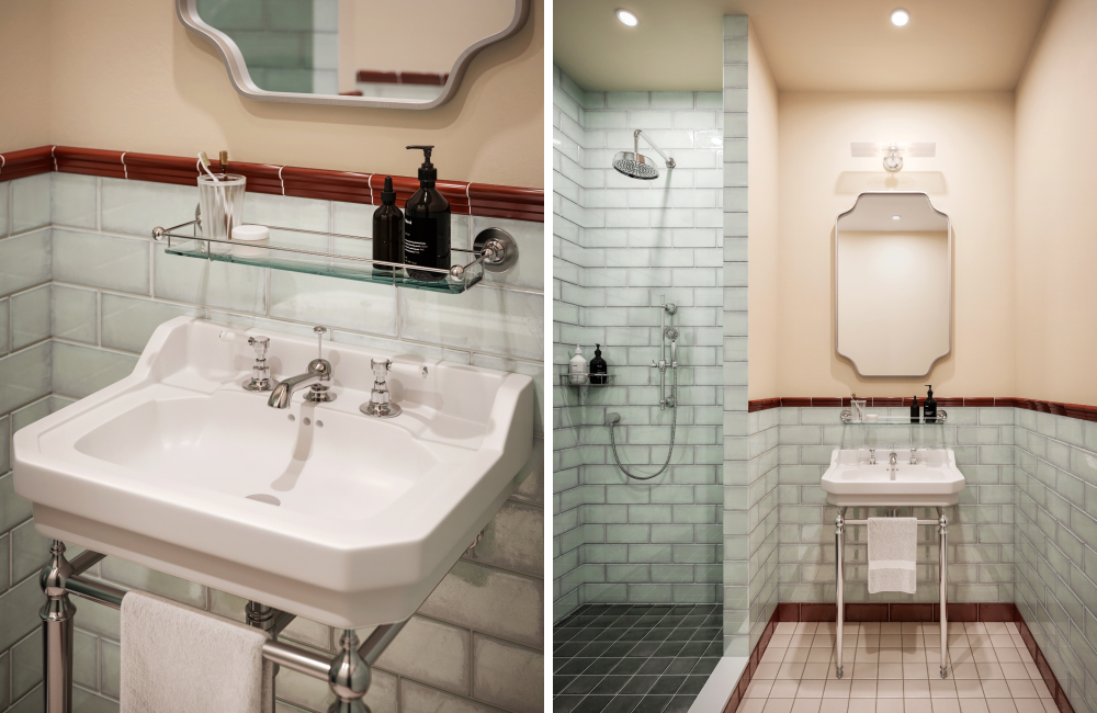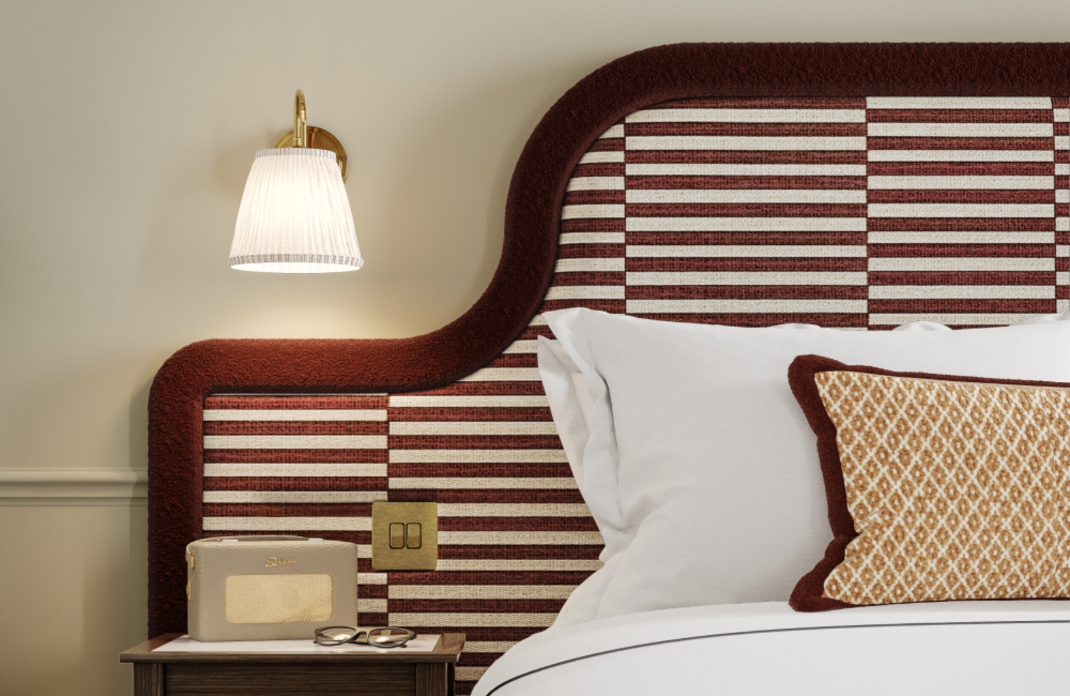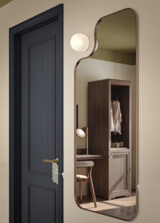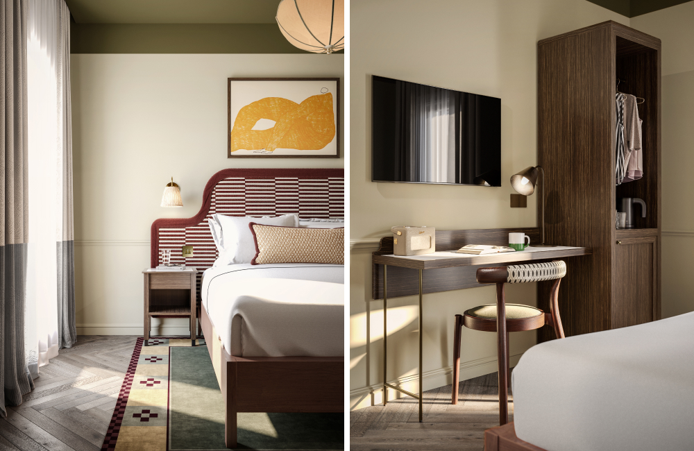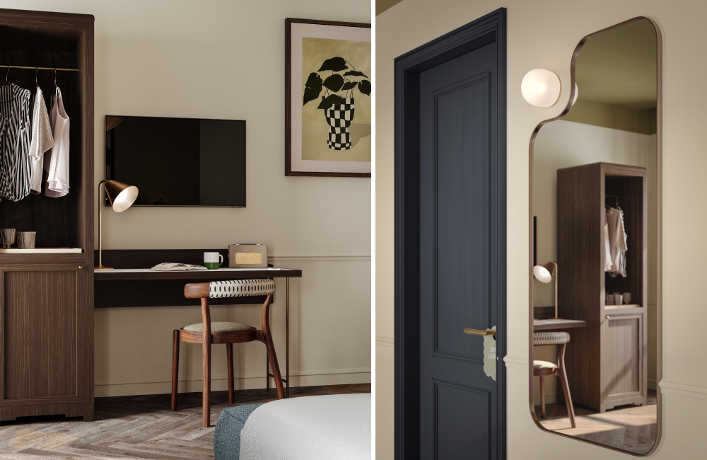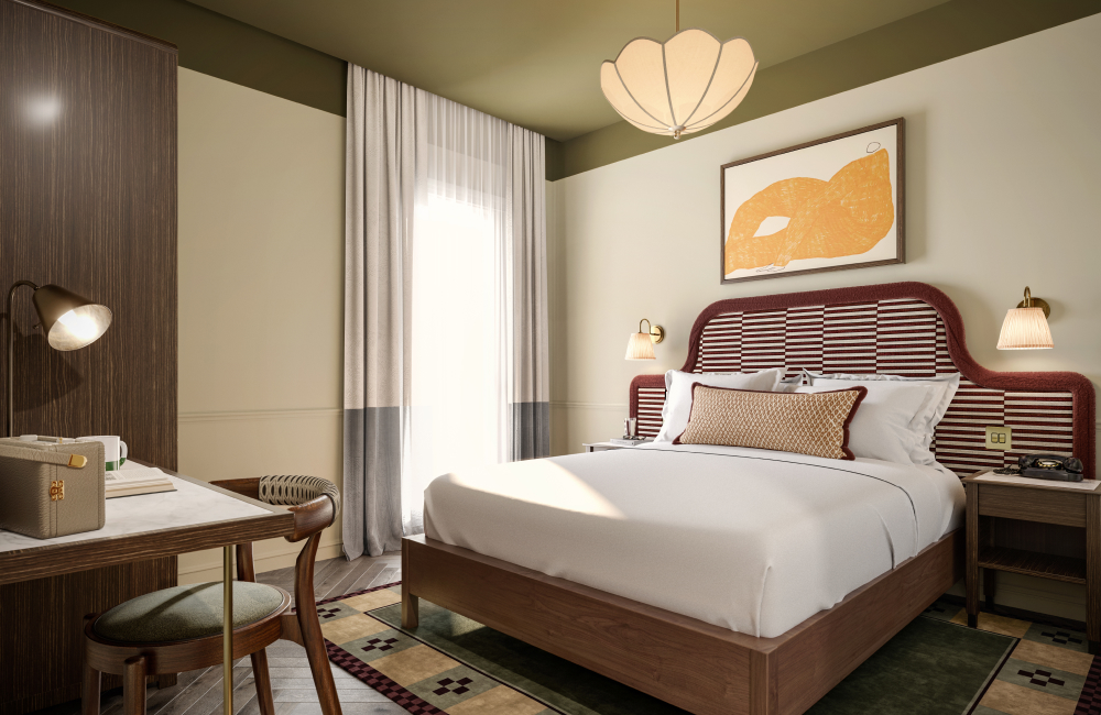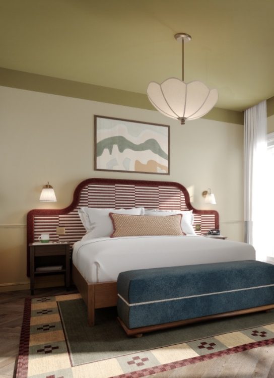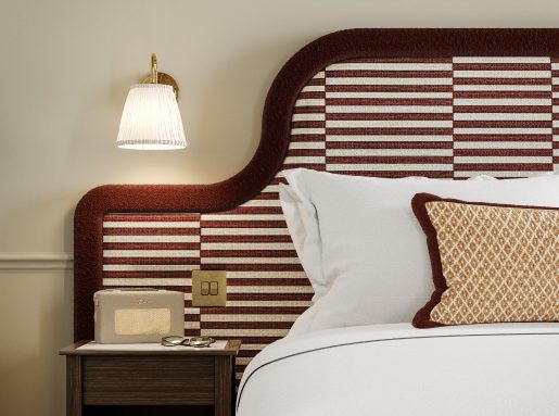 Our 129 bedrooms channel the warmth of the Irish landscape, with deep greens, soft pink velvets, and rich timber finishes. Classic silhouettes meet bold details — from scalloped pendants and fringed chairs to striped headboards and asymmetrical mirrors.