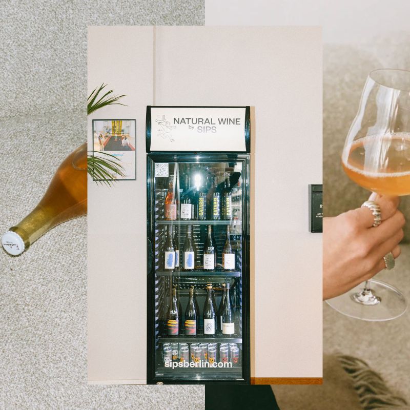 La specialità di SIPS è quella di consegnarti direttamente a casa vini naturali selezionati con cura. Abbiamo stretto una collaborazione con loro per offrirti il primo frigo di vini naturali aperto 24 ore su 24 a Berlino – sì, una specie di "SIPS Späti", se vuoi.