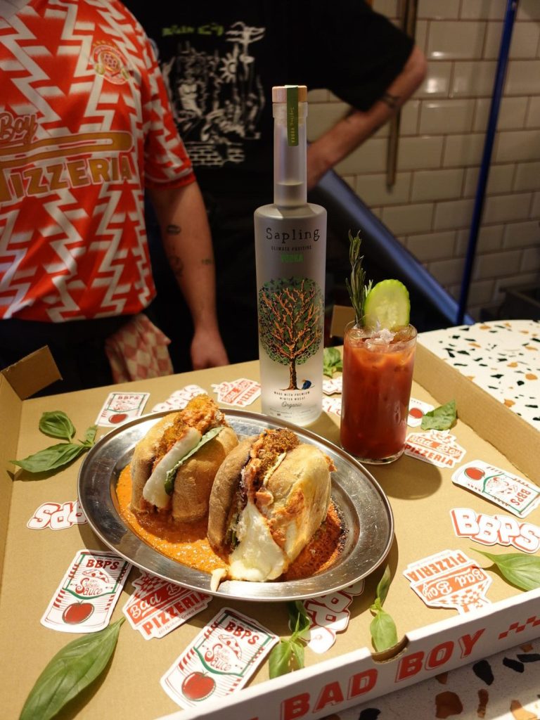 Crispy chicken, vodka sauce, prosciutto, whipped ricotta and triple cheese on a ciabatta roll. Served up with a Sapling Bloody Mary, of course.