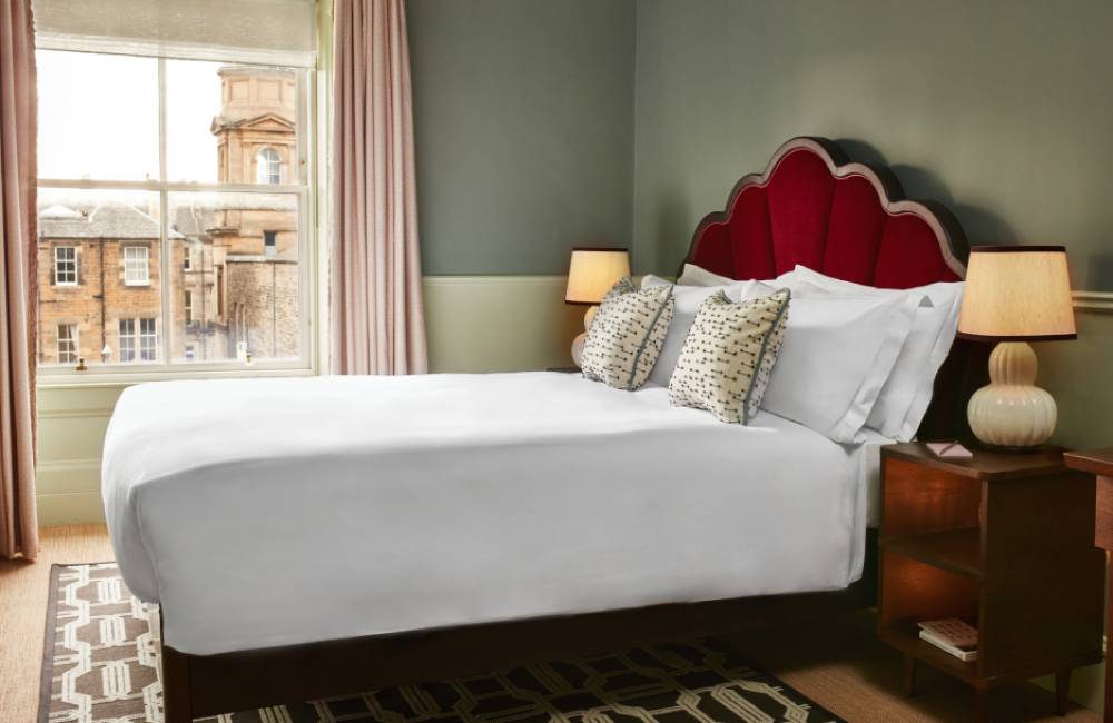 Van zachte stoffen in Georgian-tinten van roze, groen en crème tot glazen kroonluchters en lokaal tegelwerk uit Edinburgh, onze hotelkamers geven het relaxte gevoel van onze levendige wijk Haymarket weer met veel comfort van thuis.