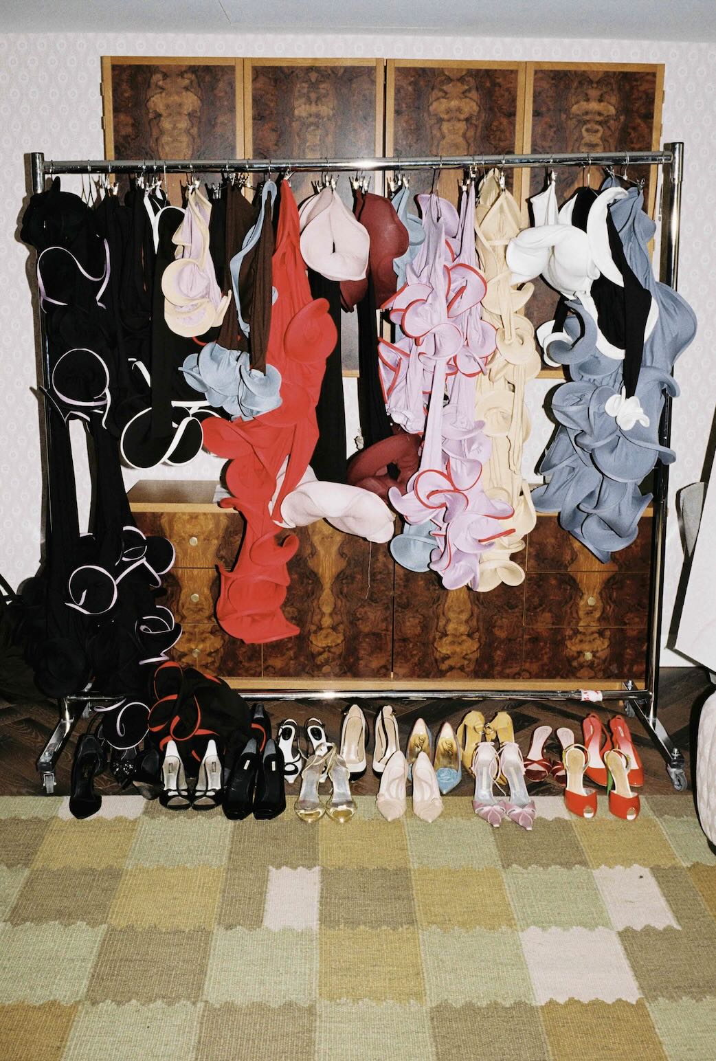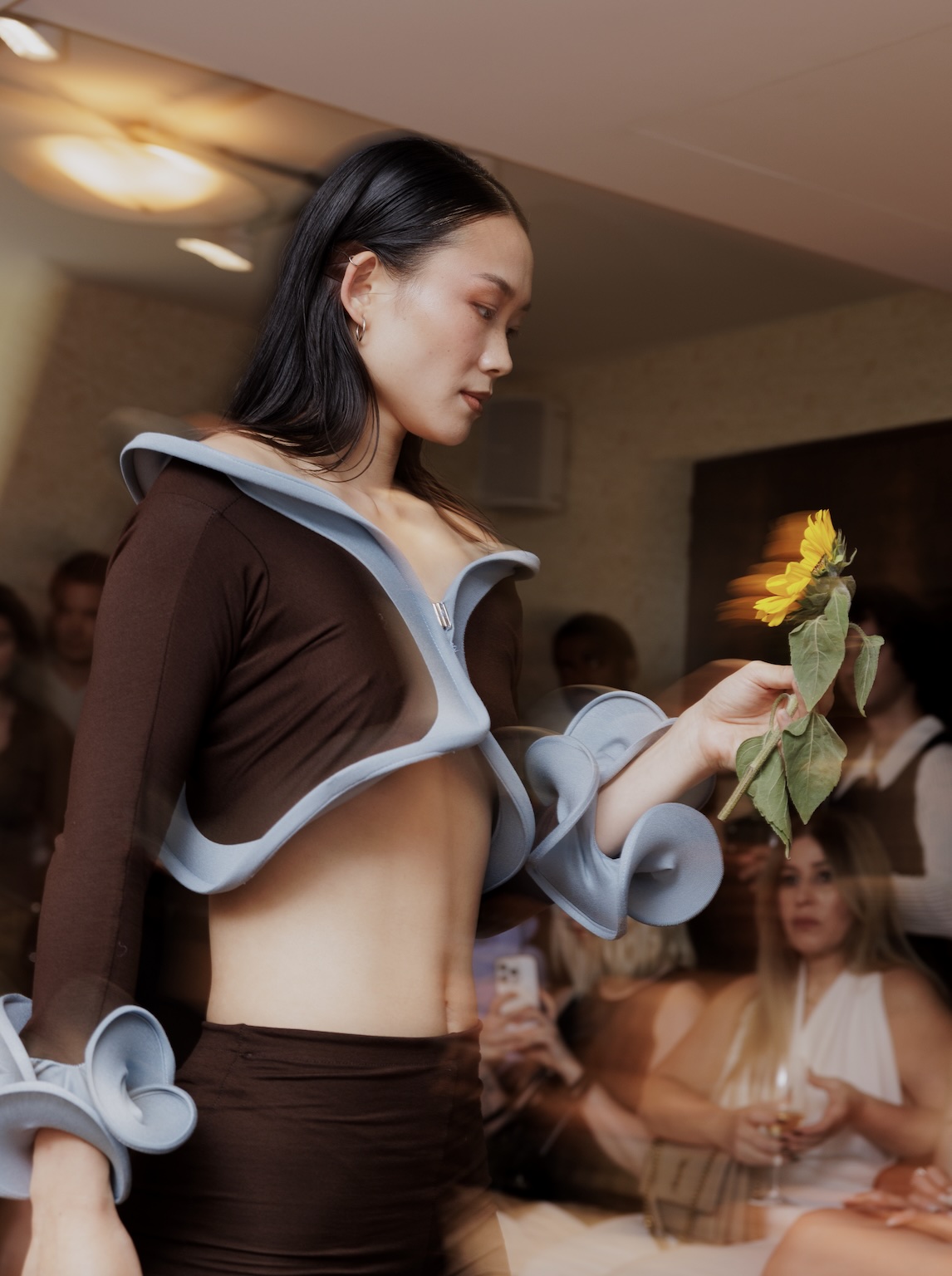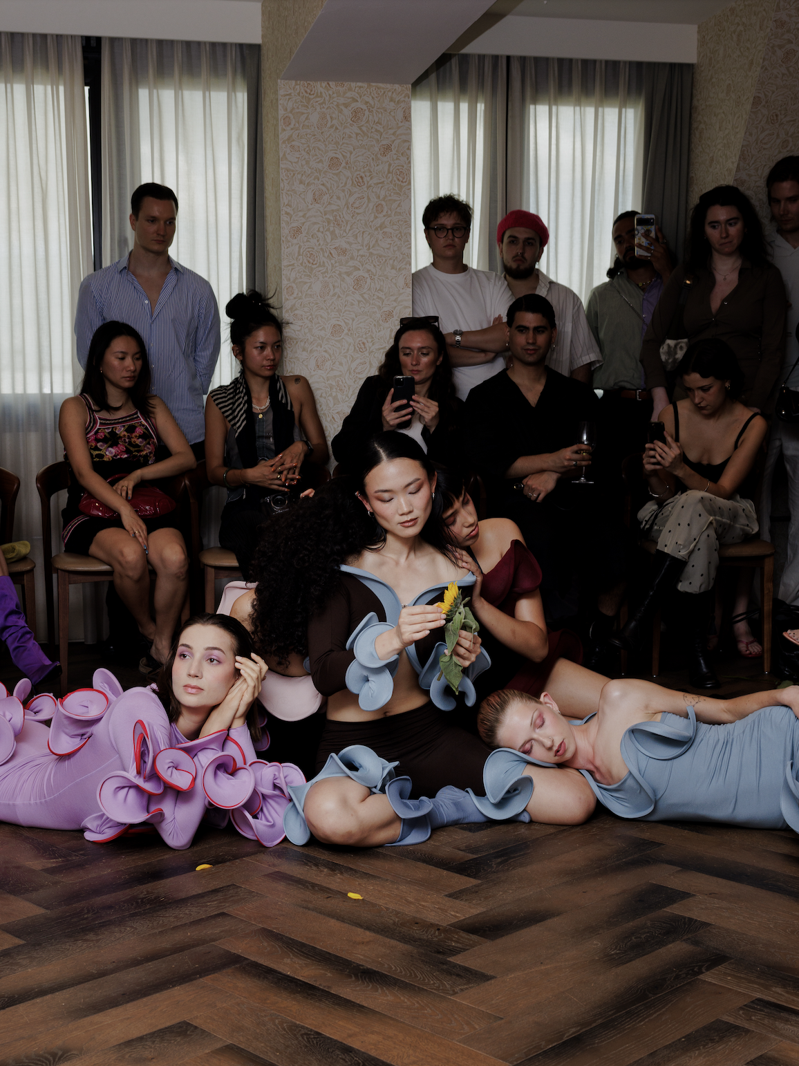On the seventh floor of The Hoxton in Charlottenburg, Berlin, a garden is in full bloom. Leafy greens and bouquets of violet calla lilies, alliums and celosias bask in the dimming light of the summer evening, filtering in through the room’s large windows. But the standouts of the space are the mannequins that line it, wearing pieces like a floor-length red dress and various tight-fitting tops and miniskirts, all variously adorned with sculptural, petal-like embellishments along their sleeves, necks and hemlines.