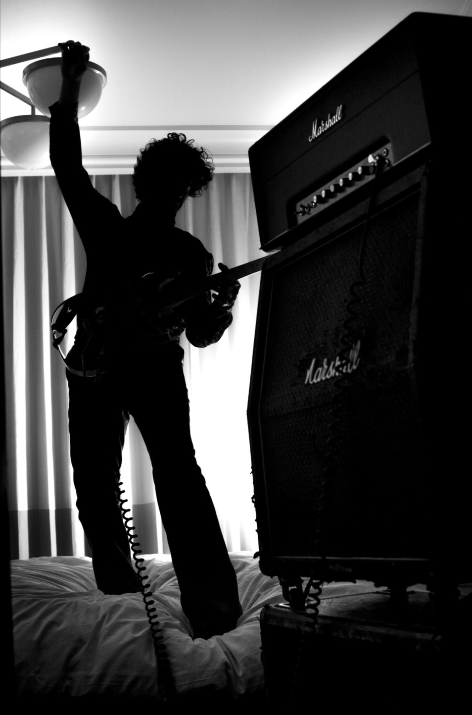 I always have my guitar and a lot of different clothes. I carry an interface and can record in my hotel room anywhere I go. I keep a skateboard at a friend’s house in each city.