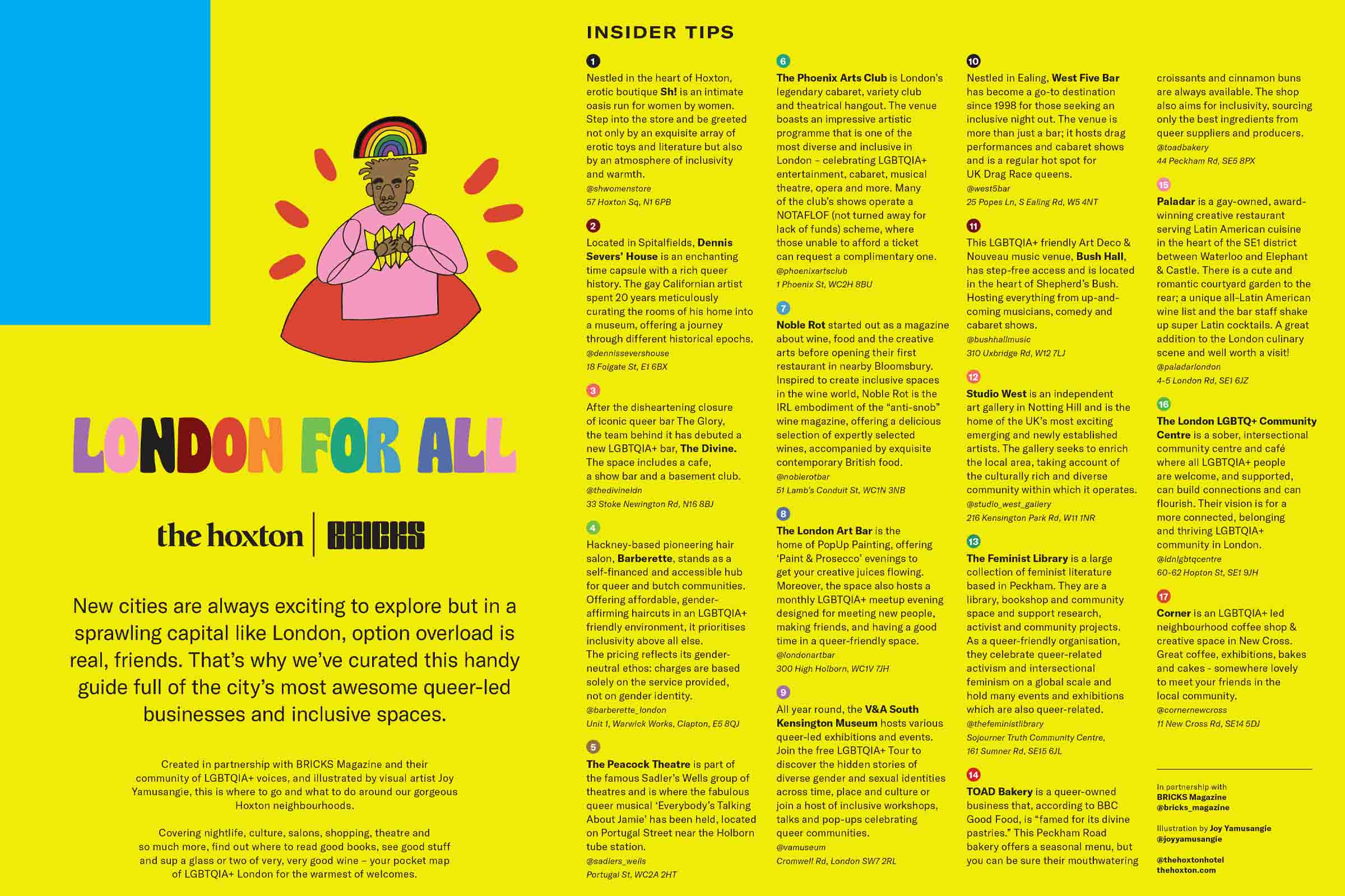 Created in partnership with BRICKS Magazine and their community of LGBTQIA+ voices, and illustrated by visual artist Joy Yamusangie, take inspiration for where to go and what to do around our gorgeous Hoxton neighbourhoods. Covering nightlife, culture, salons, shopping, theatre and so much more, find out where to read good books, see good stuff and sup a glass or two of very, very good wine – your pocket map of LGBTQIA+ London for the warmest of welcomes. The map, free to pick up at any London Hoxton front desk, is beautiful enough to frame – or at the very least fashion into a very pretty fan.