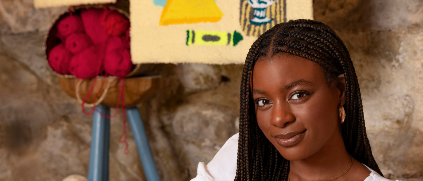 Join us in welcoming NYC based textile artist and surface designer Aliyah Salmon to our Hox Gallery. Salmon’s work explores the intersections of beauty, visibility, and the lived experiences of Black women in modern America. Working with traditional hand tufting techniques and an Oxford punch needle, she embraces a slow craft methodology that integrates collage, beadwork, and fabric, extending the legacy of textiles within the Black artistic canon. Swing by to check out her textile collection right next to Reception.Â